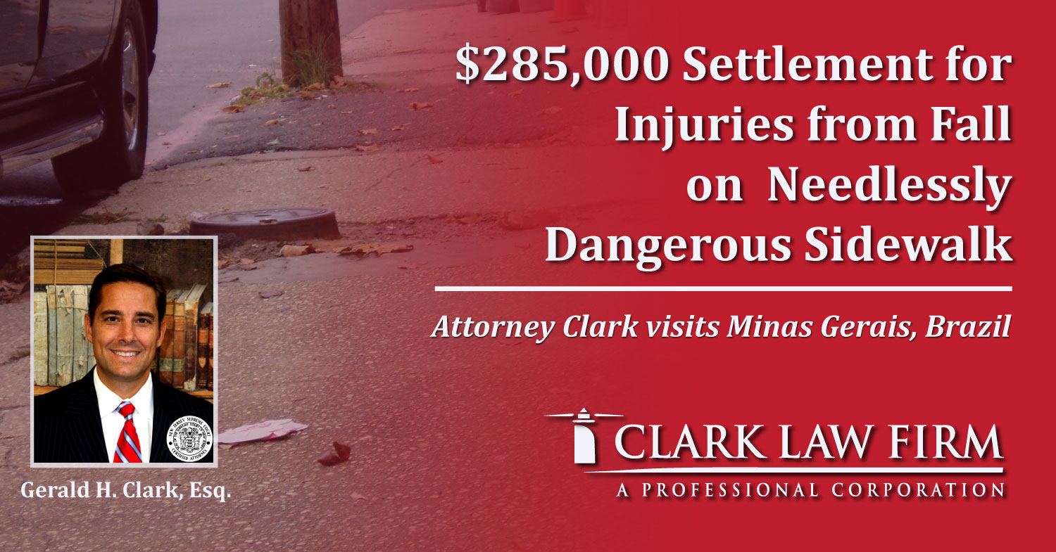 Gerald Clark recovered $285,000 for a man who fell on a broken sidewalk in Long Branch, New Jersey. The man was walking on the broken sidewalk in front of an auto repair shop in downtown Long Branch when he fell down and broke his ankle. The sidewalk had been in very poor condition for many years. There were deep ruts in the concrete and settling which exposed a pipe to stick up several inches in the middle of the walkway.