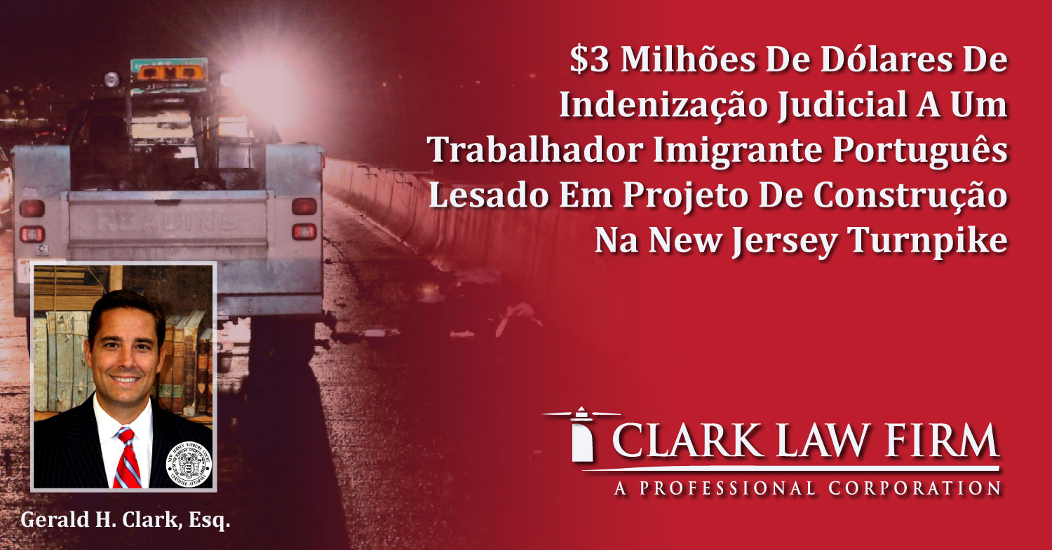 Gerard H. Clark, da firma de advocacia Clark Law Firm, Advogado Especializado em Direitos dos Trabalhadores Imigrantes, recuperou mais de US$ 3 milhões em indenização por acidente de um trabalhador da construção civil, imigrante português de 48 anos, nascido na província de Estremadura, em Portugal. O litigante, estava trabalhando no dia 10 de dezembro de 2013 no turno noturno, em um projeto de recapeamento de New Jersey Turnpike, próximo a Hackensack, Nova Jersey. Enquanto trabalhava pegando destroços da construção, o funcionário foi atropelado por um caminhão dirigido por um encarregado. O caminhão não possuía alarme de ré ou câmera, infringindo as regras de segurança da OSHA – Conselho Administrativo de Segurança e Saúde Ocupacional.